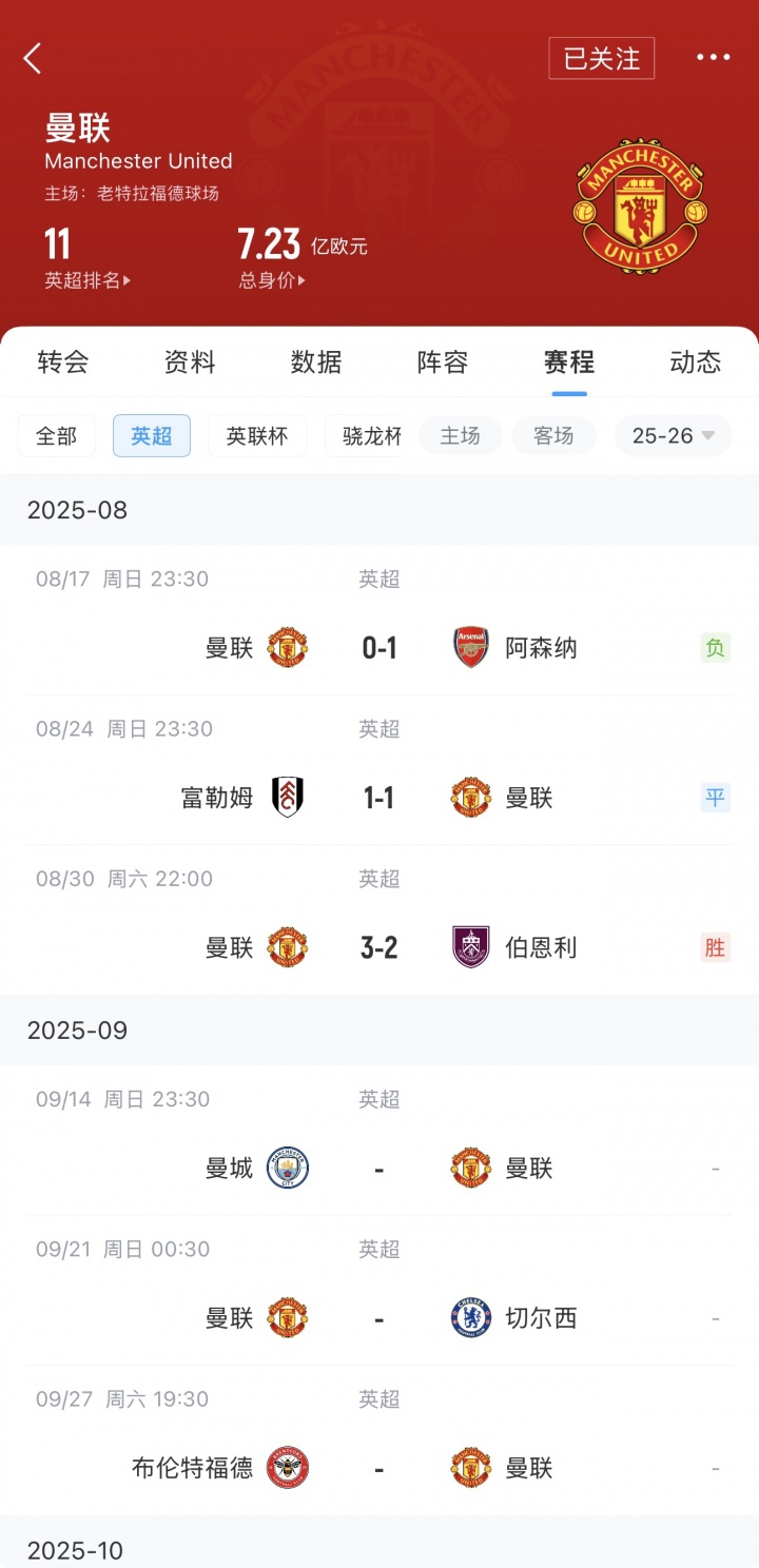 阿莫林帅位危?曼联开赛1胜1平2负4分排名第14,下轮主场作战 战切尔西