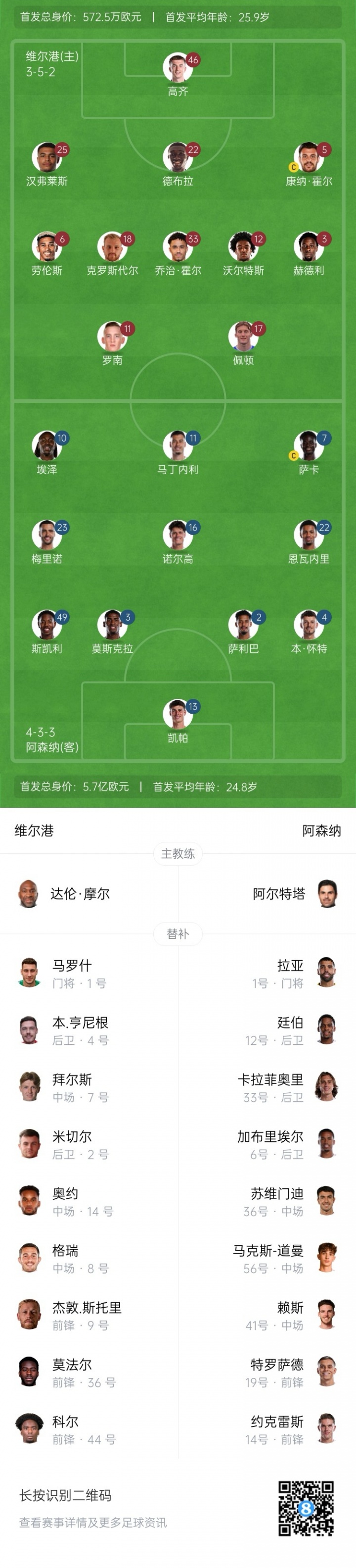 维尔港杆位:46-乔·高齐、22-德布拉、25-汉弗莱斯、5-康纳·霍尔、3-赫德利、6-乔丹·加布里埃尔、12-沃尔特斯、18-克罗斯代尔、33-乔治·霍尔、11-罗南-柯蒂斯、17-佩顿