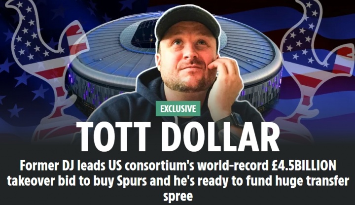 太阳报表示由科技企业家布鲁克林-厄里克组建的一个12人队伍 提出了这一惊人的报价。厄里克和他的协同 伙伴出价33亿镑想买下热刺,并准备再拨出12亿英镑作为球员预算,包括工资、转会费和经纪人费用,供热刺主指导教练员弗兰克在明年一月转会窗开启后使用。这一总报价超过2022年由伯利财团以42.5亿镑收购切尔西。