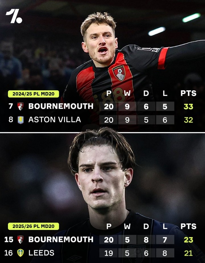 伯恩茅斯上赛季同期高居第7,本赛季少10分只排在第15