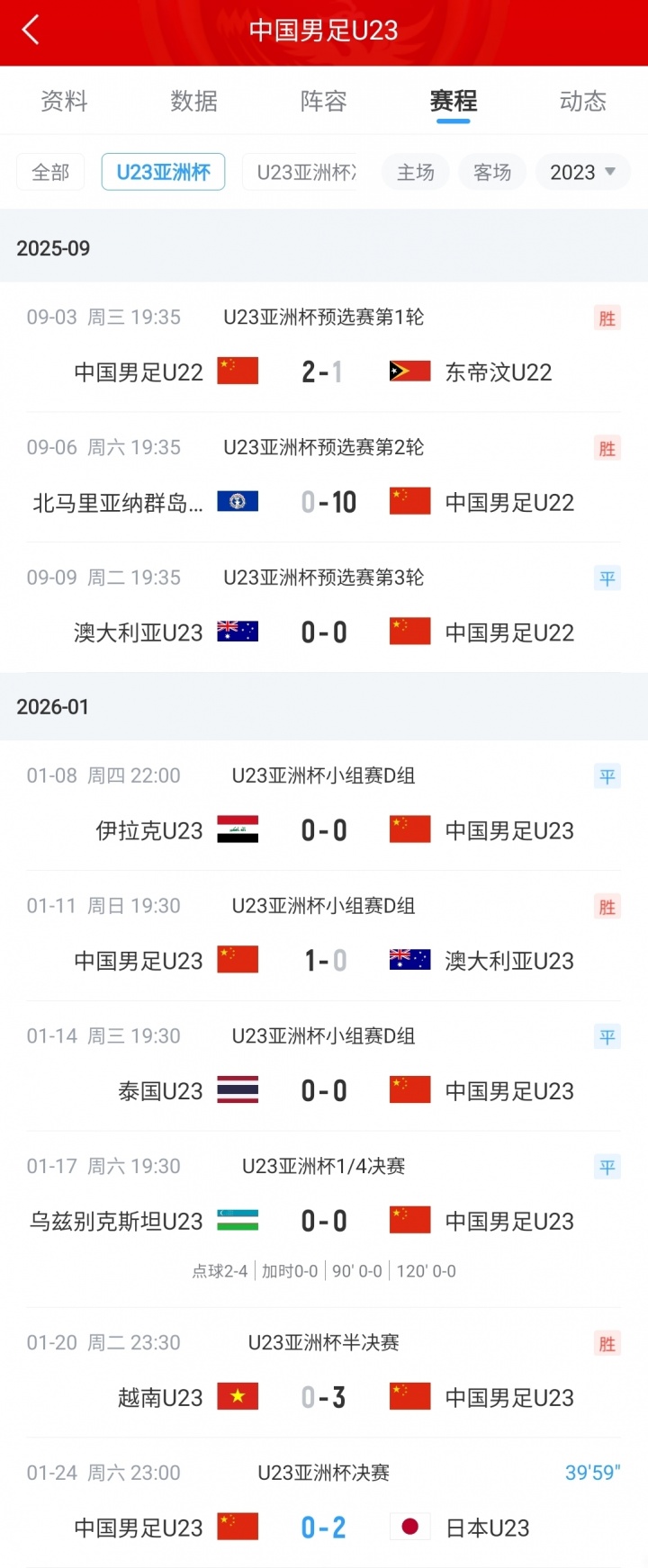 同时U23国足正式赛事 不丢球记录也定格在710分钟,上次丢球还是2-1击败东帝汶U23的预选赛上。