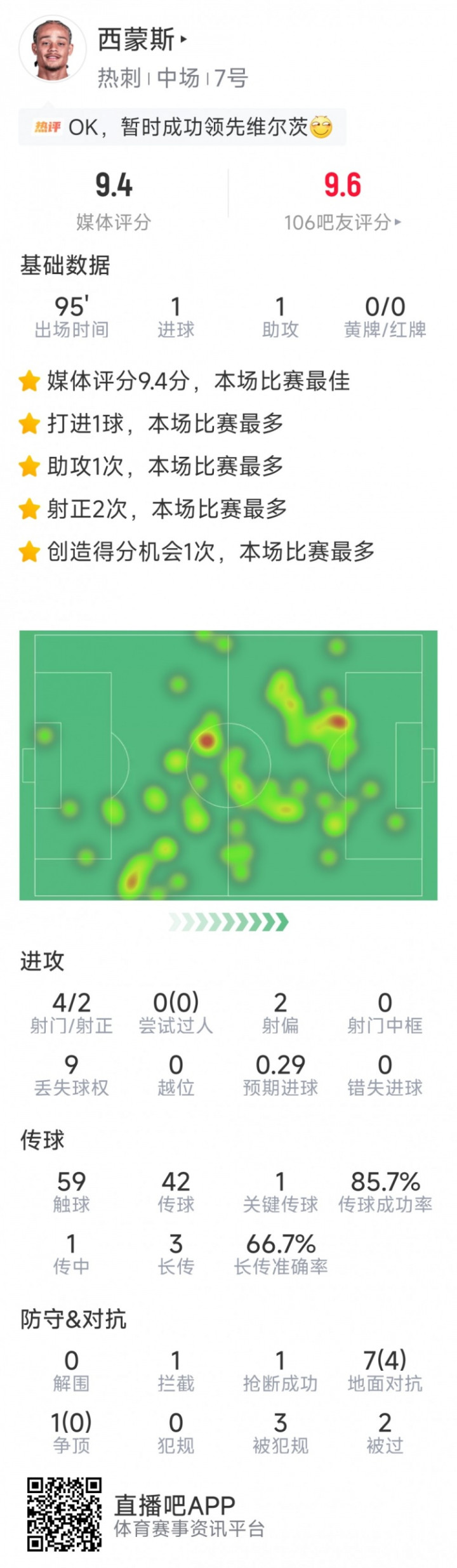 直播吧12月7日讯在本轮英超热刺2-0击败布伦特福德的赛事 中,哈维·西蒙斯传射建功,苏超直播在线观看以下为他在本场数据: