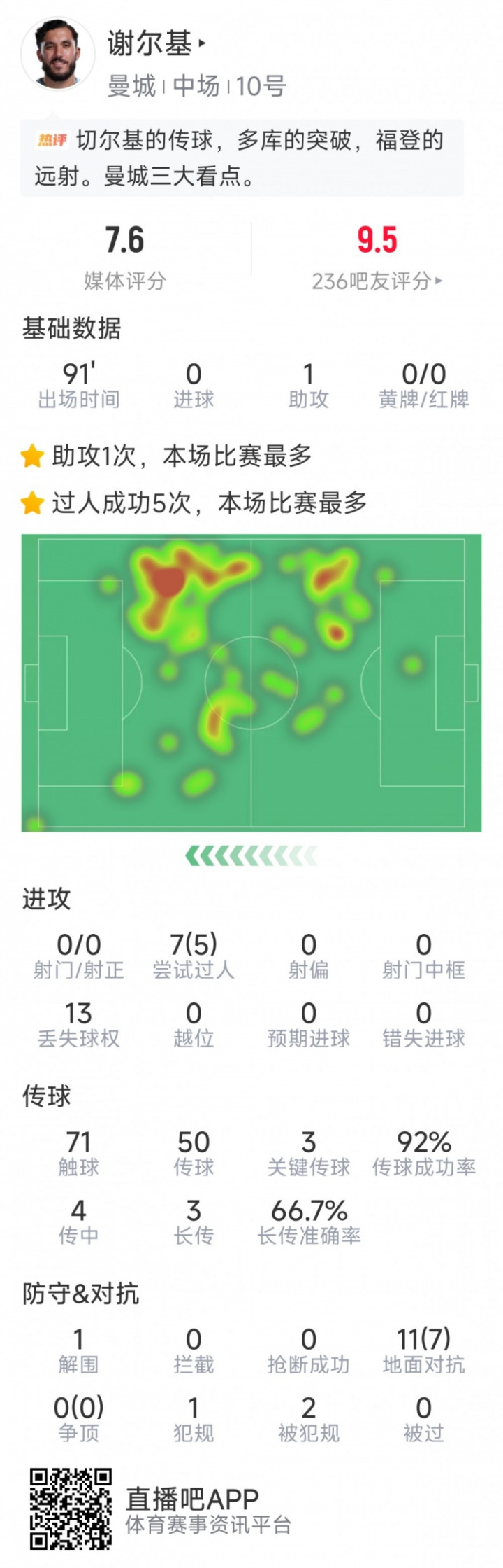 谢尔基本场数据: 1次助功 , 3次关键传送球 , 7次过人5次成功