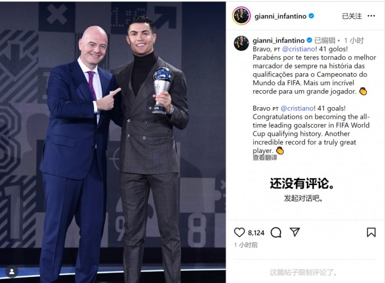 C罗职业生涯至今世预赛打进41球,独享世预赛历史射手王荣誉,苏超直播国际足联主席因凡蒂诺社媒晒出与C罗的合照,对他表示祝贺。