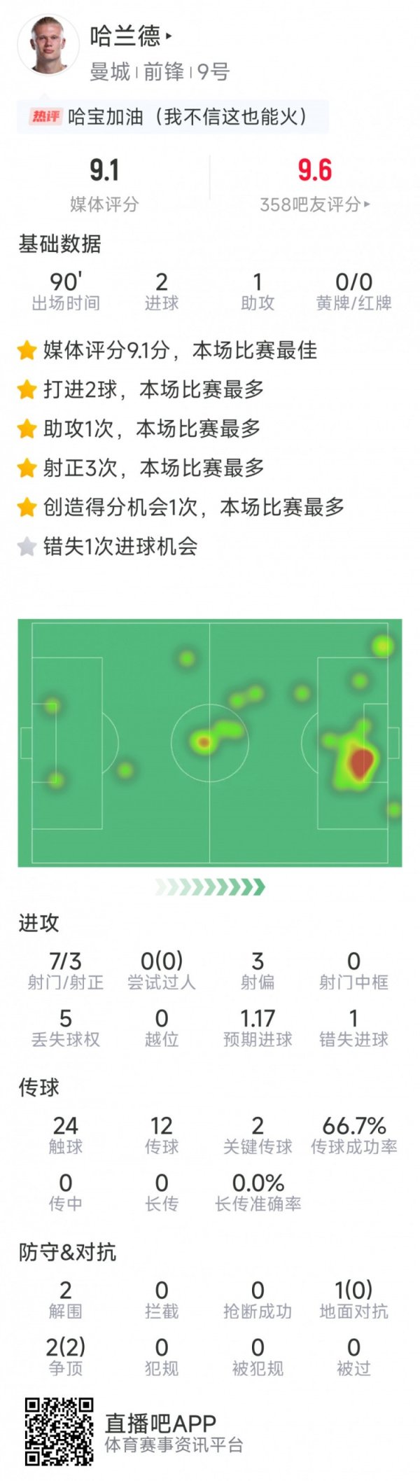 哈兰德本场数据: 2粒得分 , 1次助功 , 7射3正, 2次关键传送球